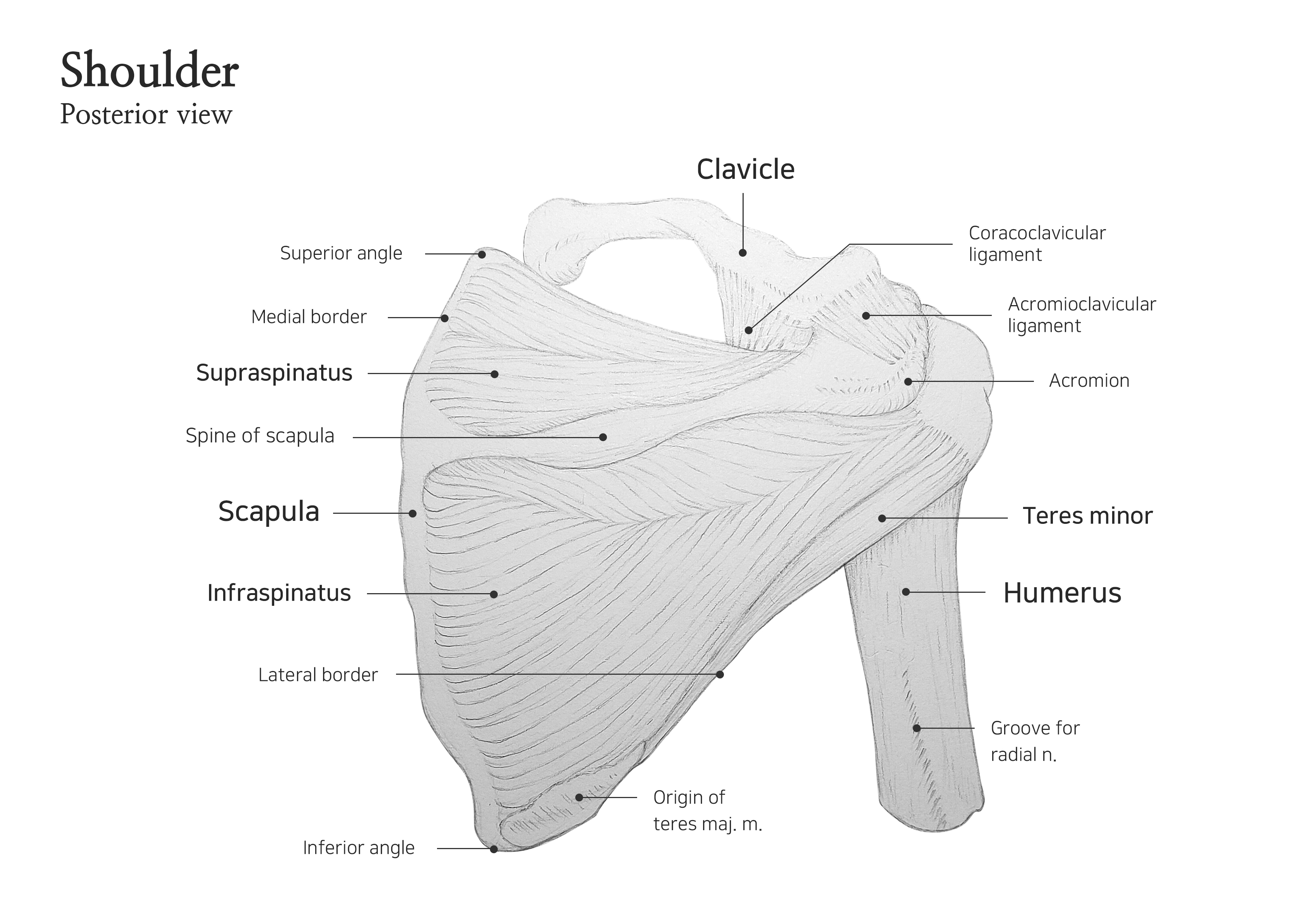 어깨뼈 표본을 뒤에서 보았을 때, 관찰할 수 있는 뼈의 구조와 근육을 연필로 드로잉하였다.