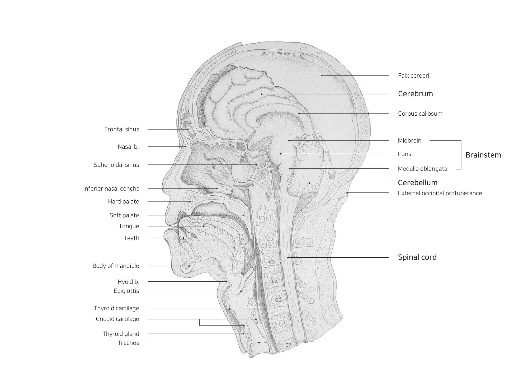 머리와 목 부분 표본의 정중시상단면을 관찰하여 얼굴과 머리 그리고 목의 구조물을 연필로 표현하였다.