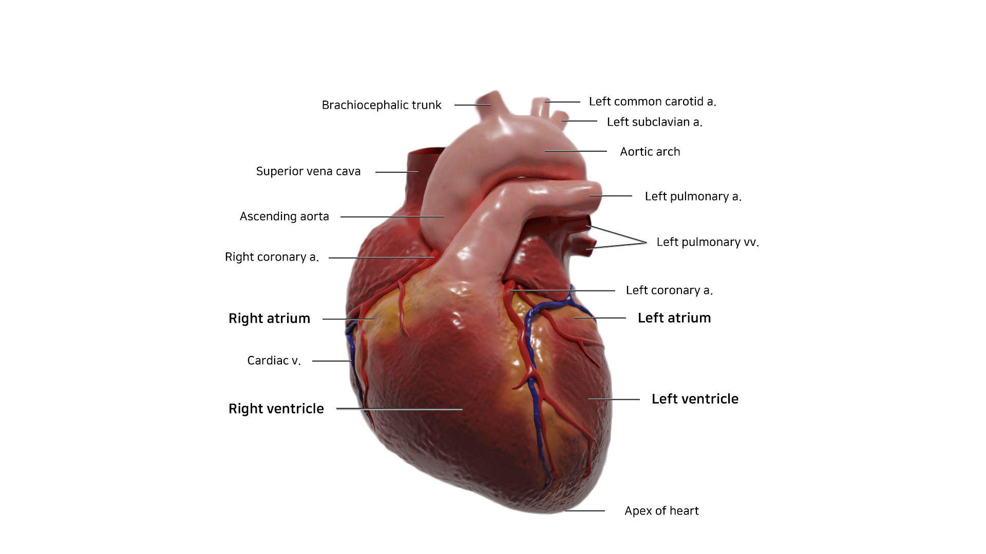 심장을 모델링, 텍스쳐링, 렌더링 후 anterior, posterior view에서 관찰되는 구조물을 라벨링하였다.