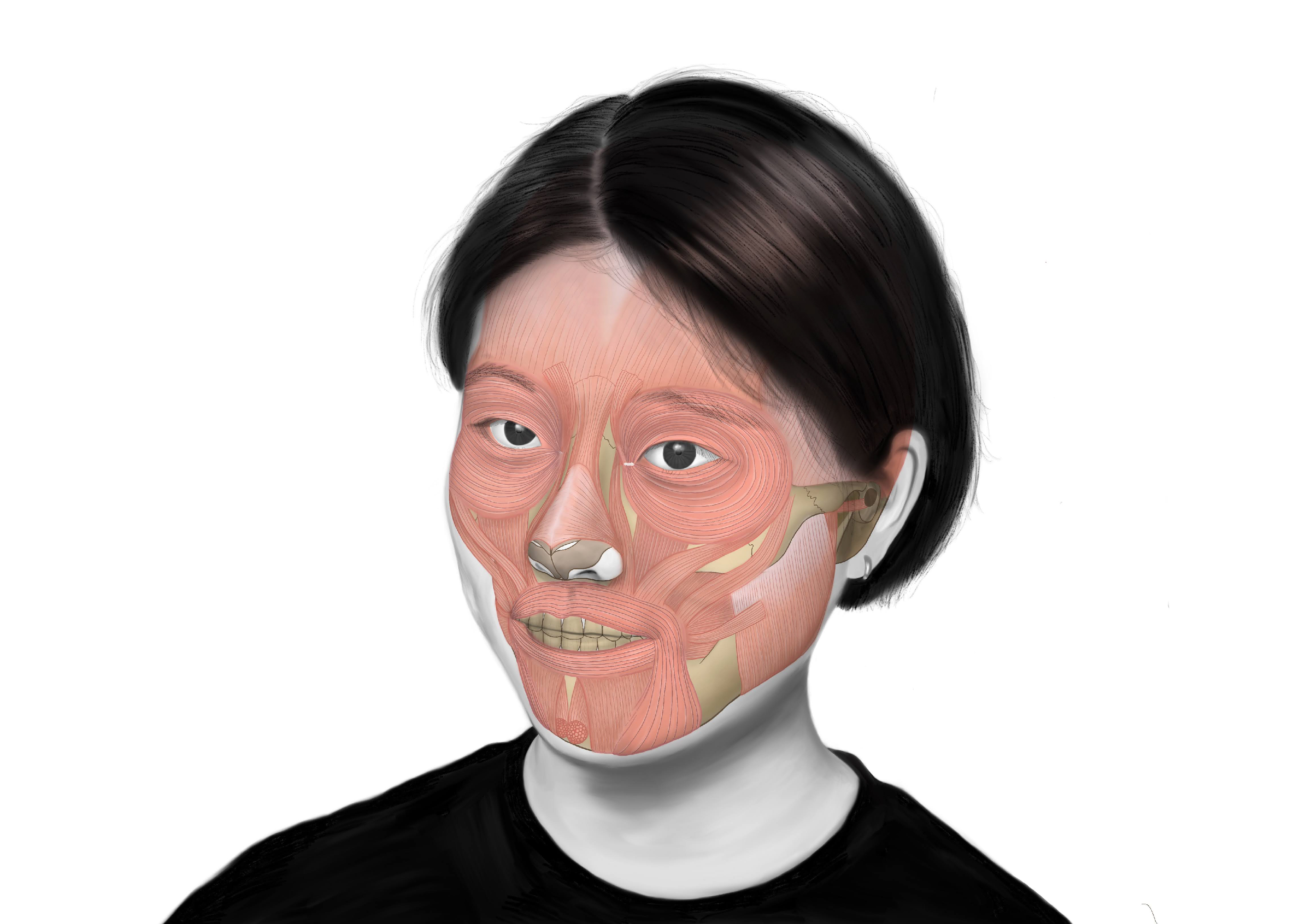 자화상을 그리고, 두개골과 얼굴 근육을 그려서 합성하였다.