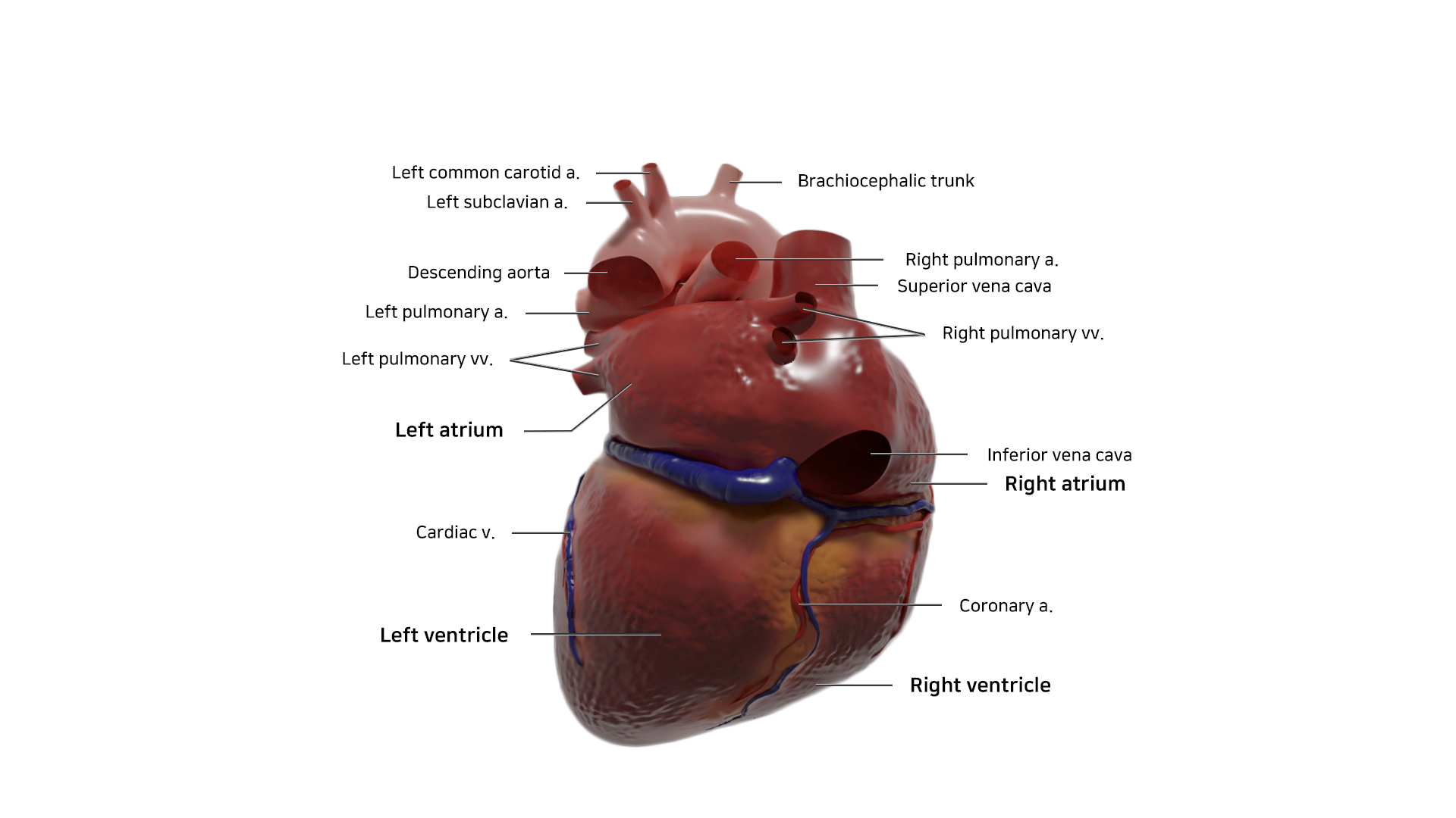 심장을 모델링, 텍스쳐링, 렌더링 후 anterior, posterior view에서 관찰되는 구조물을 라벨링하였다.